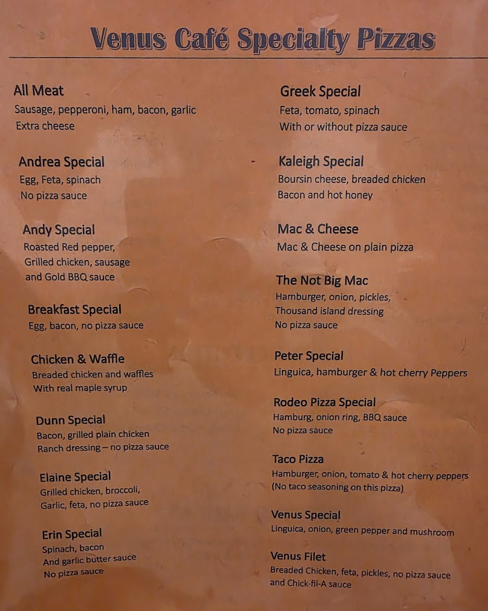 The menu at Venus Cafe offers a comforting selection centered around classic and specialty pizzas, presenting a relaxed, casual dining experience that suits a variety of occasions. Whether you’re stopping by for a quick lunch, gathering with friends for a casual dinner, or ordering takeout for a cozy night in, the food here matches the easygoing atmosphere of the neighborhood pizza spot.