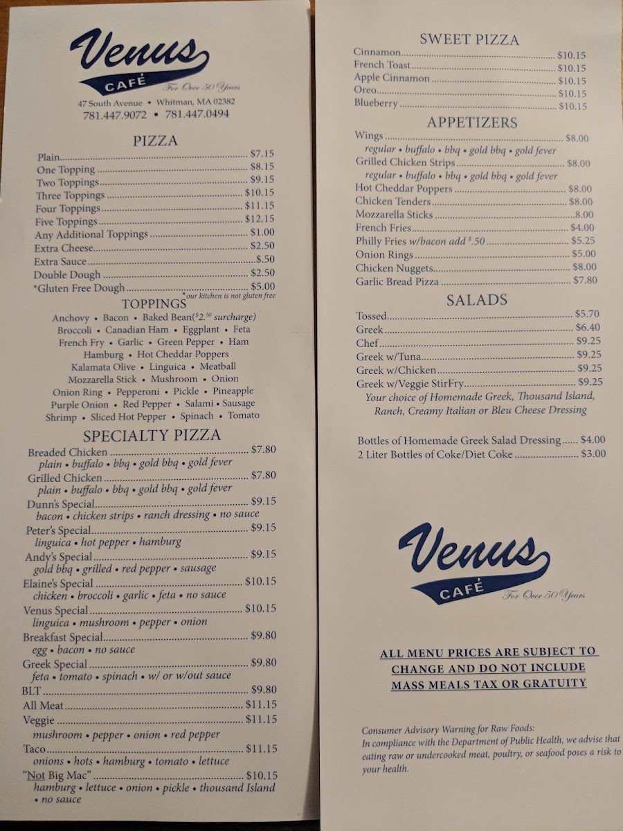 Venus Cafe Menu